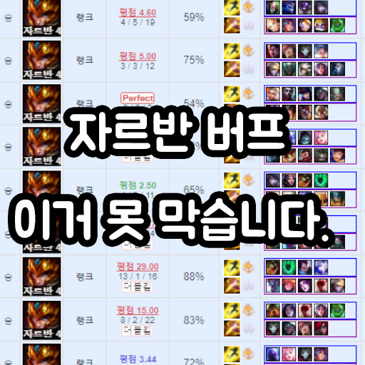 시즌2부터 스카너 아니면 자르반 리 신이 정글 챔피언으로 사용하기 무난한 픽이다보니 숙련도가 없을 수 없는 챔피언인데요. (EQ에어본 W슬로우 패시브 활용 등) 이번 자르반 버프? 그렇겠구나 하면서 별 생각 없었는데 사기챔프에 가까웠습니다.