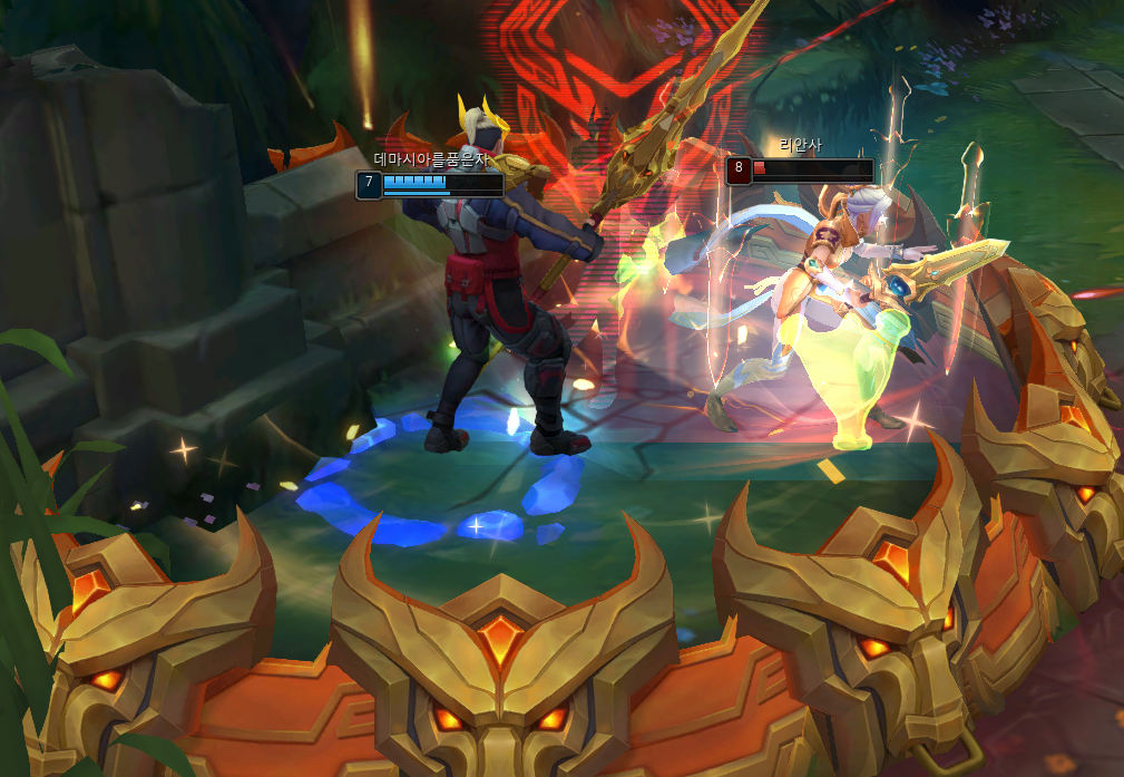 1레벨에 창 패시브 공속 + 전장의 군가 퍼뎀 200 80~90씩 박힘(도트뎀 포함) 선레드 동선일 때 무지성 2렙갱 효율도 패시브 맞췄다는 기준 하에 좋고, 신짜오의 EQQQ 무지성 지나갑니다 갱킹처럼, 끈사를 활용한 데마시아의 깃발 + 용의 일격 EQ평만 쓰고 빠졌을 때 순간적인 극초반 딜 교환 부분에서 밀리지가 않음.