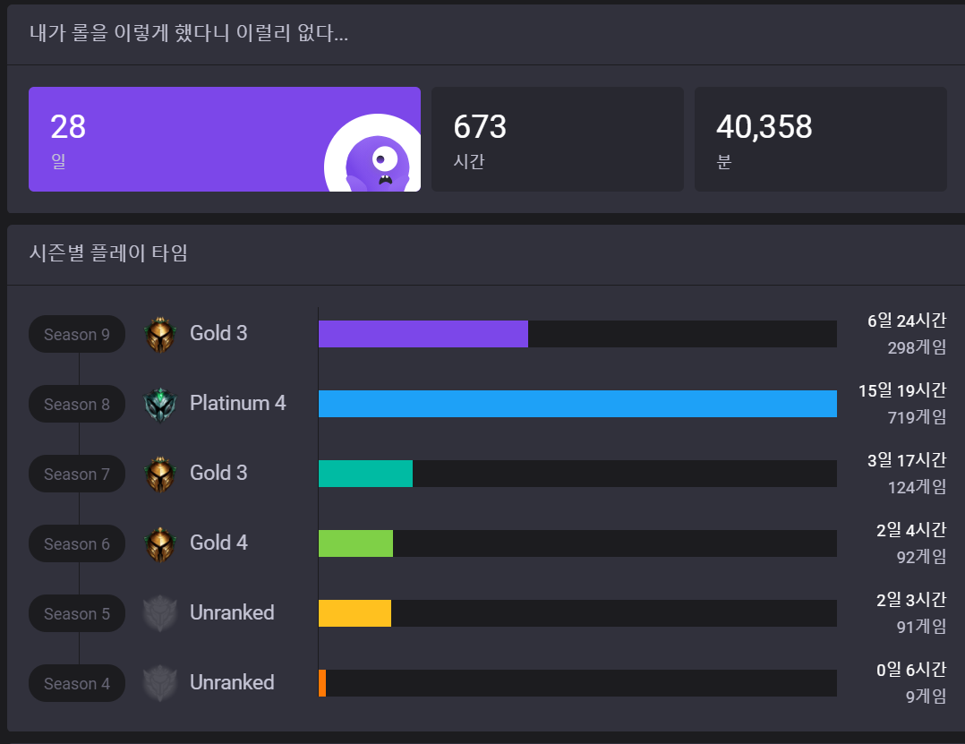 상대방 솔랭 티어는 현 골드4 전시즌 플레4 시즌 78910 골골골플4 현시즌 180판 오버패 골드4 팀랭 600판 실버였나 골드였나 확실히 기억이 나진 않네요.