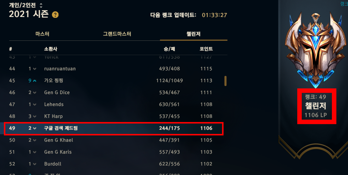 솔로랭크 점수 1106점, 현챌 49위