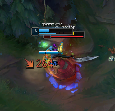 암살 준비하고 있는 리신(용의 분노 갖고 있는 상태, 빨간 강타도 있음), 기인 시야에는 리 신 안 보임
