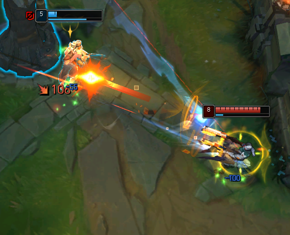 1레벨 퀸 평타, 루시안 Q 딜교환, 미니언 관통Q 맞춰서 체력 뺌