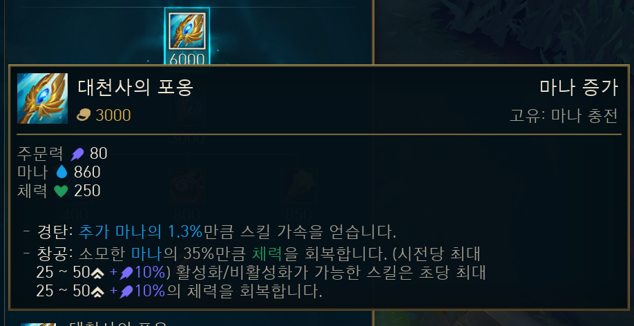 이번에 대천사의 포옹과 같이 사용했을 때 기존 라이즈와 카사딘이 첫 코어 아이템으로 올렸던 영겁의 지팡이의 효과를 가져올 뿐 아니라, 쿨감 17퍼(스킬가속 20, 카사딘의 경우 쿨감룬을 사용하기도 해서 변동이 있습니다.)