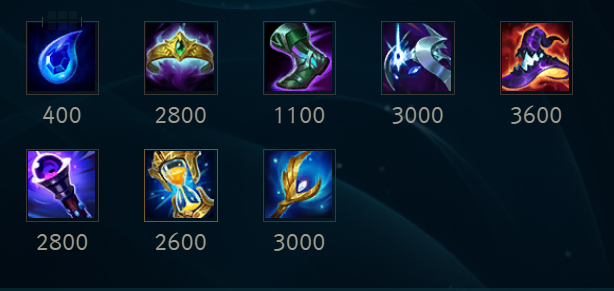 카사딘 궁극기 4스택 0.9 AP계수, 무의 구체 힘의 파동 Q,E 0.7 0.8 게수, 황천의 검 0.8계수로 사실상 AP계수가 굉장히 높은 편이라 흔히 말하는 몸짱 카사딘 빌드(2코어 프로즌 하트 구입) 등 빌드 연구가 꽤 되어 있는 편인데, 이번 신규 신화 아이템은 룬 변동 없이 만년서리를 전혀 사용하지 않는 게 핵심 빌드입니다.