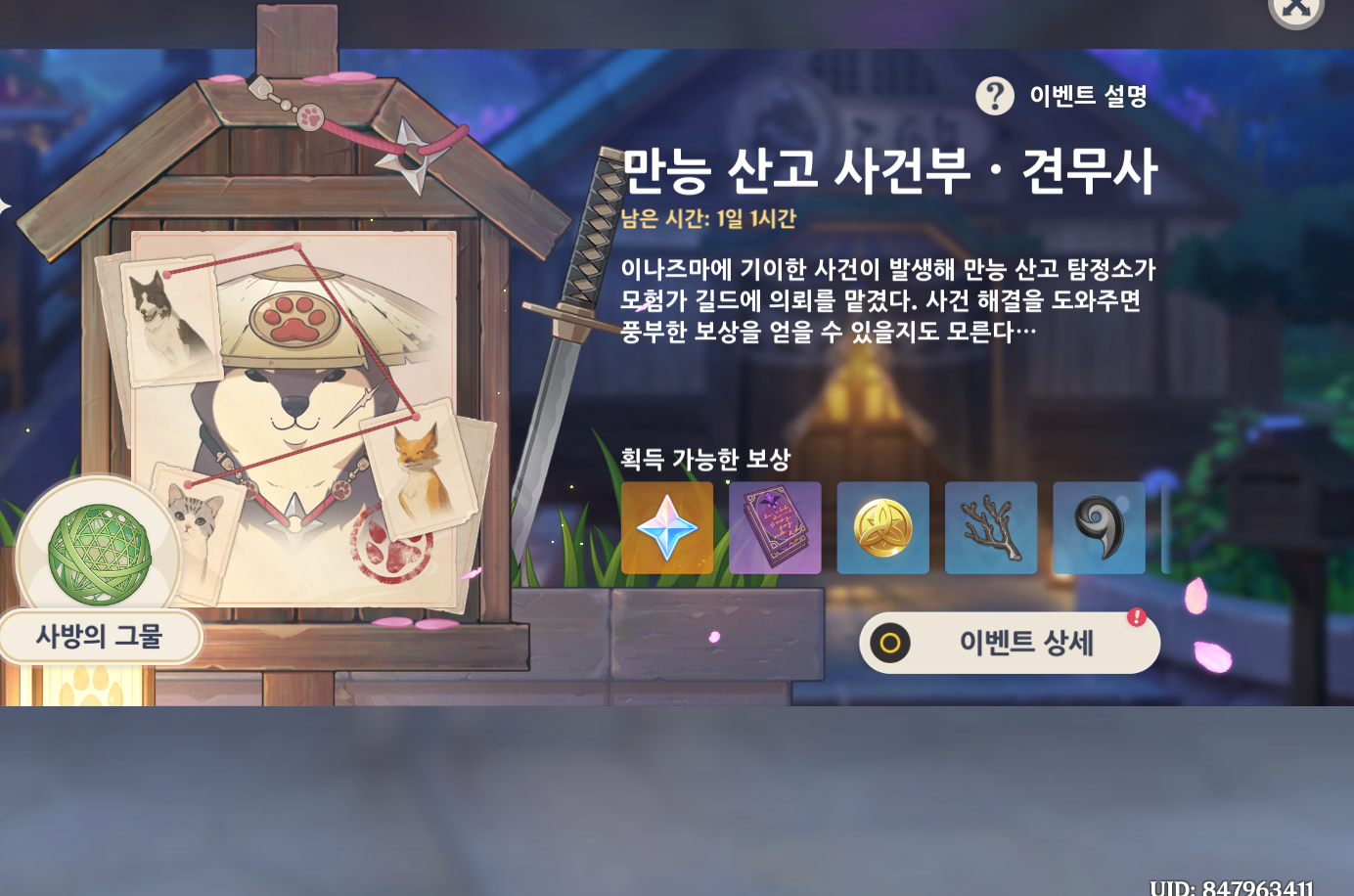 도적의 소굴에서 애타게 구조를 기다리는 동물들이 갇혀있습니다. 주변의 보물사냥단, 해란귀을 해치우고 강아지 두 마리를 구출하면 오전 6시에 이나즈마 나루카미섬에 위치한 만능 산고 탐정 사무소로 다시 귀환해서 류지를 만나야 합니다.