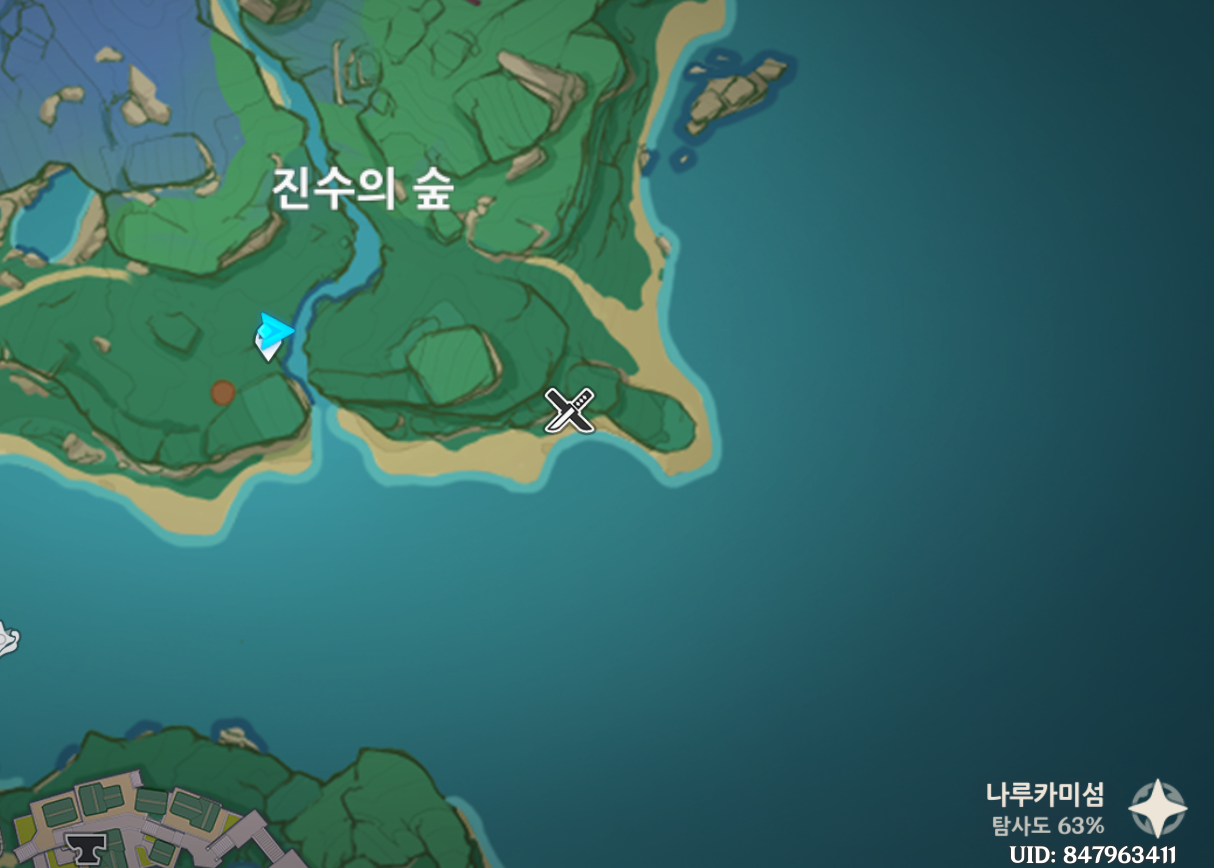 두 번쨰 위치는 진수의 숲 남동쪽에 그려진 쌍수 단검, 이제 진수의 숲으로 이동