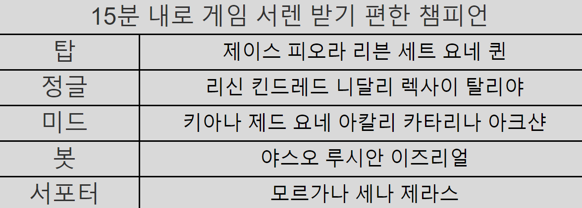 시간별로 정리함 반박시 니말이 맞음 전부 플레3 밑 기준이고 듀오랭이 아닌 솔랭 혼자 했을 때 서렌 받아내기 빠른 챔피언 기준임.