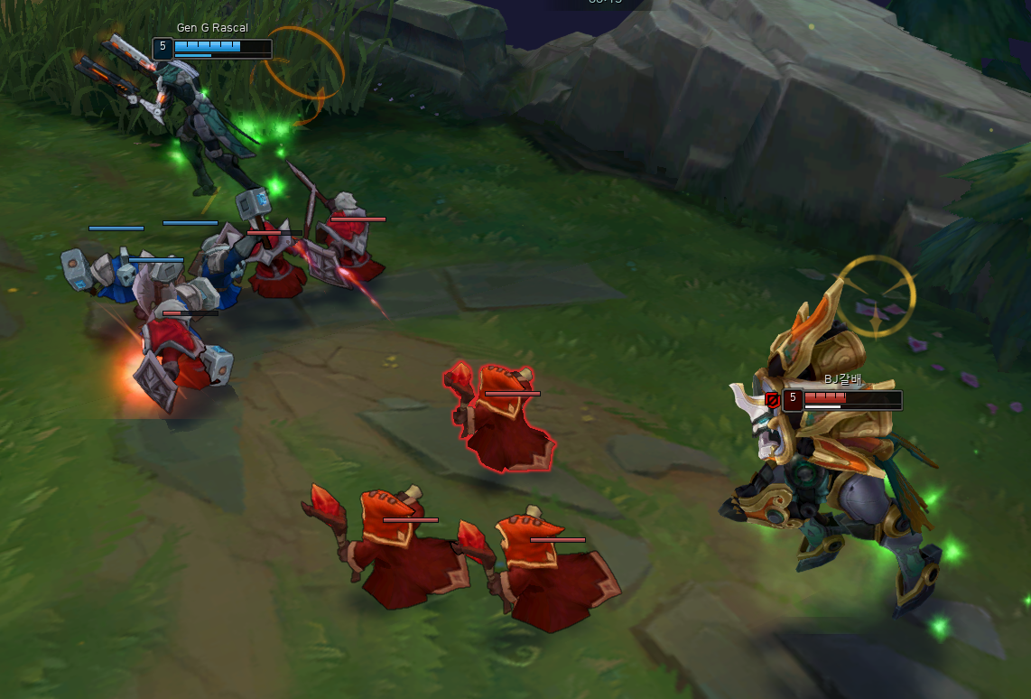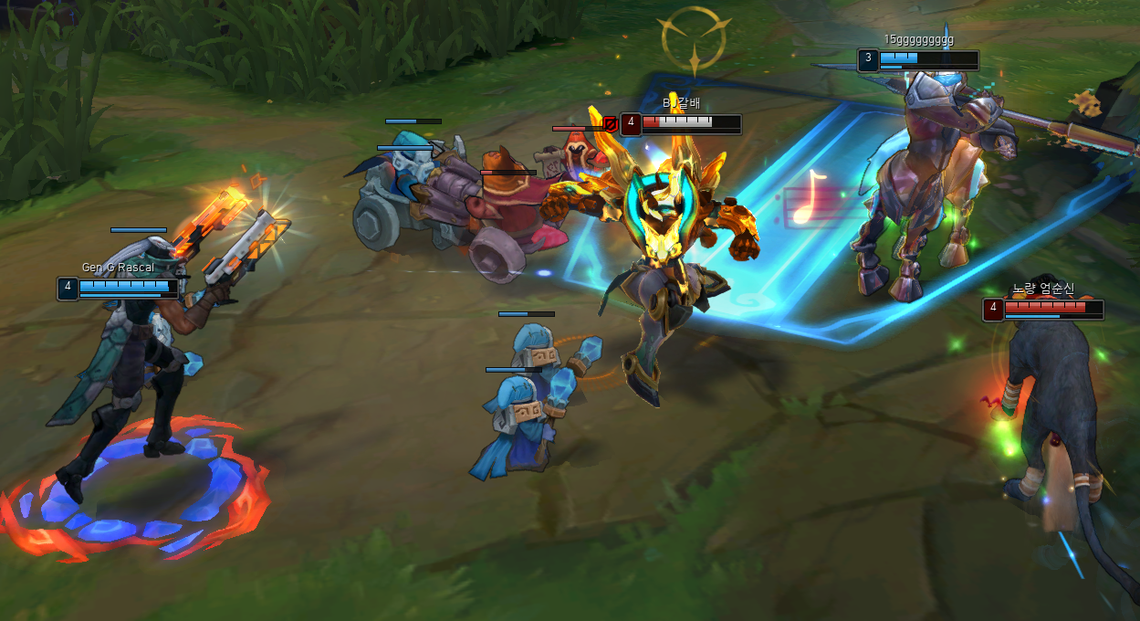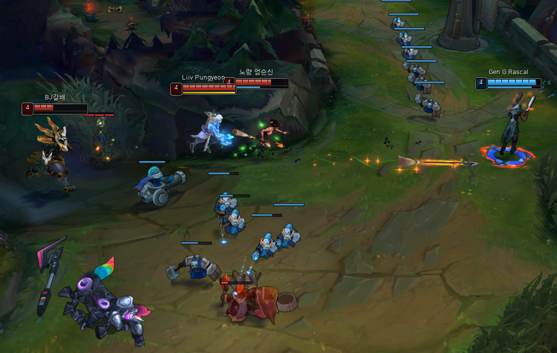 이런 상황일 때, 루시안이 저돌적으로 돌진해서 오히려 죽는 일이 생기거나, 역으로 다이브 했다가 게임이 끝나는 변수가 생길 수 있는데, 근거리 입장에서는 모든 스킬을 최대한 아껴야 합니다.