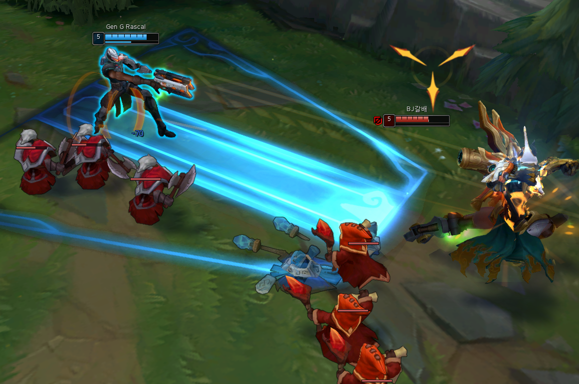 루시안의 Q스킬을 미니언에게 사용하면 사정거리가 닿지 않는 챔피언에게 피해를 입힐 수 있습니다.