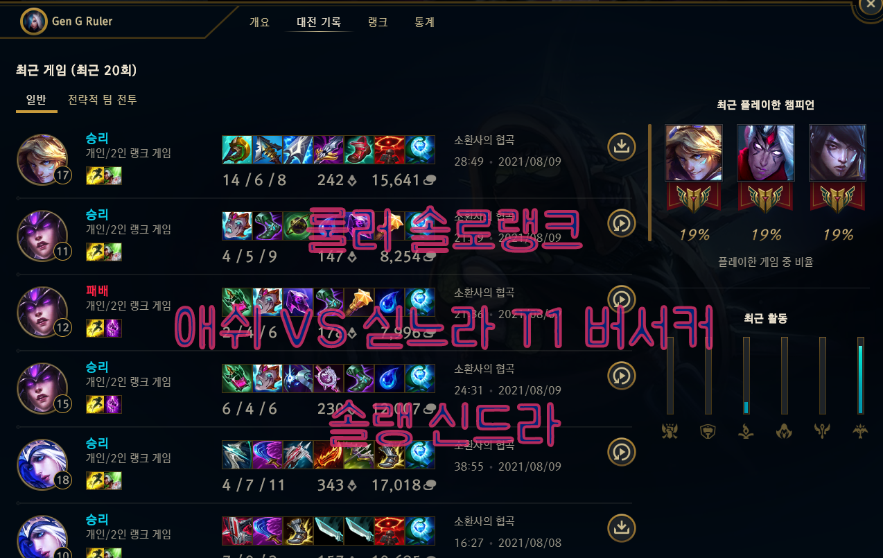 | 개인적인 LCK 선수별 시그니처 챔피언 월즈까지 향할 수 있는 선수는? (0) | 2021.07.27 |