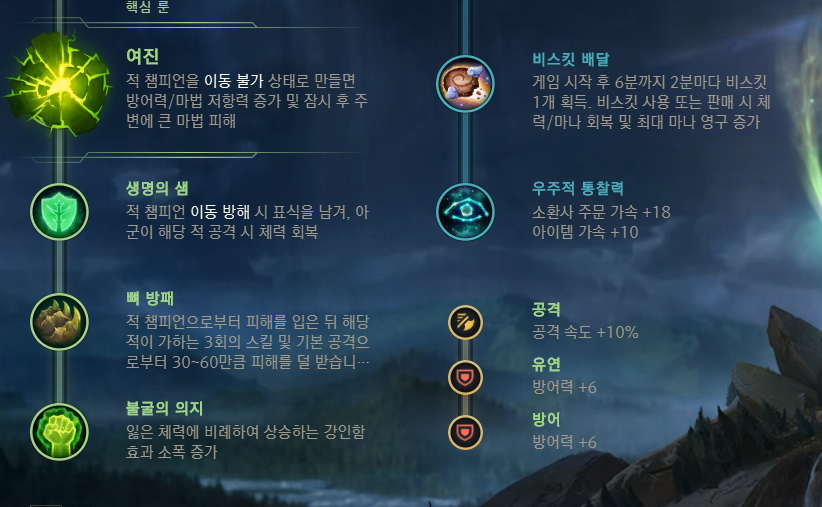 어차피 맞아서 여진 터트리면 딜교환에서 굉장히 유리하고, 캐리형 포지션이 아닌 어시스턴트형 서포터 포지션이니 이속을 최대한 올려서 사용하려는 빌드처럼 보이는데 평타 근거리 딜포터 세트, 판테온 상대로 꺼냈을 때 꽤 좋은 것 같습니다.
