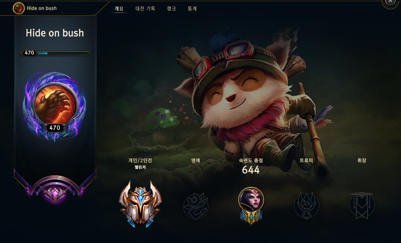 서치하다가 알게 된 정보입니다. 바텀에서 은신형 원거리 딜러 챔피언과 이름이 똑같은 인터넷 방송 플랫폼에서 활동하고 있는 저명한 퀸 유저. 듀오가 불가능한 시즌11에서 퀸 탑솔으로 현챌을 유지만 하고 있는 게 아니고 솔로큐 계속 플레이하는 유저니까 실력에 대해 언급할 이유가 없다.