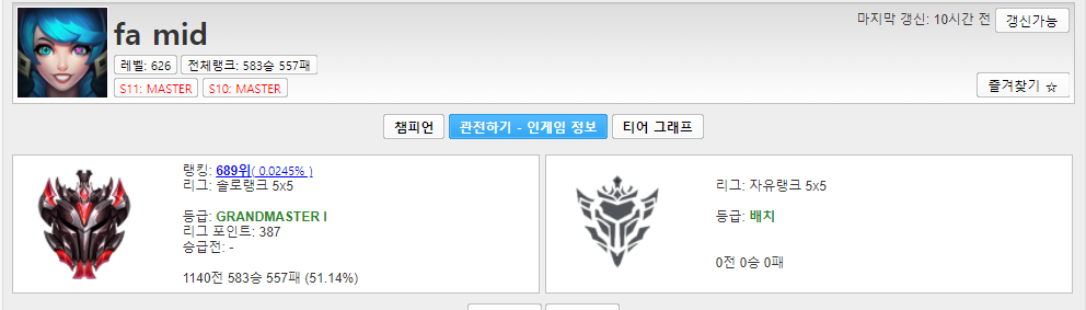 노력 끈기 집중 원딜 모스트, FA MID 쟤랑 스크림 기록 있던데 3군으로 예상됨, SDX와 마찬가지로 썡배 계정인데 의미 없고 이미 쌓인 판수가 많으므로 쌩배충이니 뭐니 하는 건 정말 의미 없고