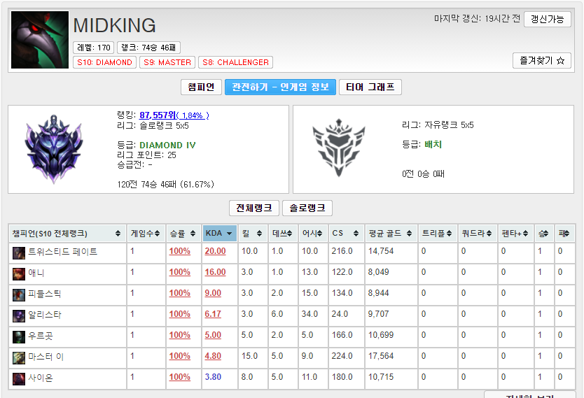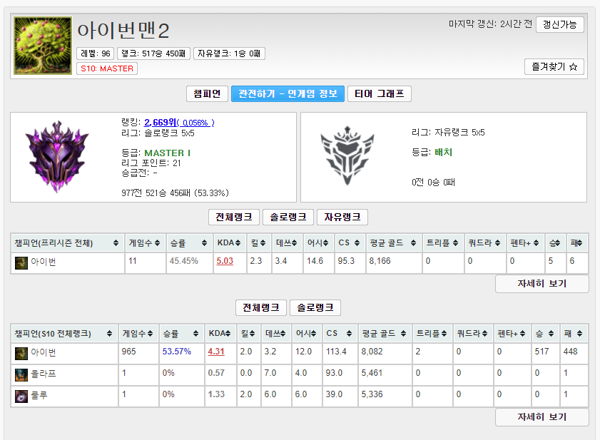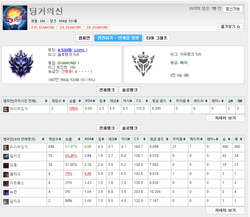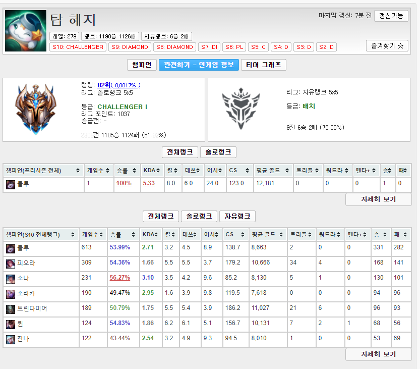 2인 솔랭 및 자유랭크 3인큐, 5인큐, 격전, 마이너 대회 및 1부리그 대회 제외함.