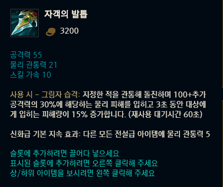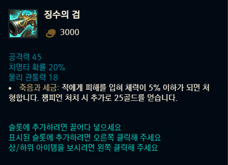 본문 내용으로 돌아가서, 분명 누군가가 이번 시즌에 새로 빌드업된 아이템 중 리안드리의 고뇌, 쿨타임 20초, 사실상 잘 사용하기만 하면 확정 기절로 쓸 수 있는 아이템 체력 5% 미만일 때 스킬 또는 평타 한 방이면 재사용 대기시간 없이 처형시키는 징수의 검, 어쌔신용 아이템으로 쓸 수 있는 자객의 발톱