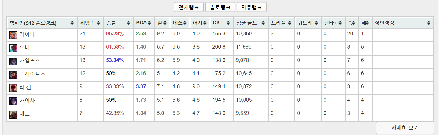 기존에는 카서스 정글, 에코 정글 위주로 솔랭 점수를 올렸다면, 이번 시즌은 그암 케인과 키아나로 크게 점수를 올린 것을 확인할 수 있습니다.