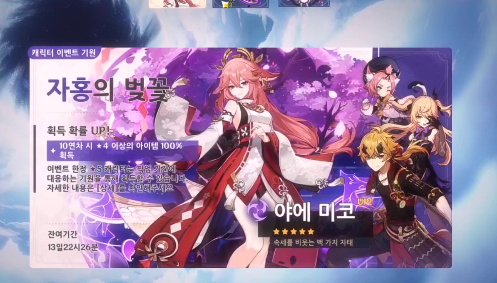 정세의 아홉 기둥 임무 완료 보상으로 50 원소를 추가로 얻고, 야에미코 픽업 기간이라 1뽑을 돌렸는데 결과가 좋지 못해 10뽑이나 할 걸 후회가 되네요.