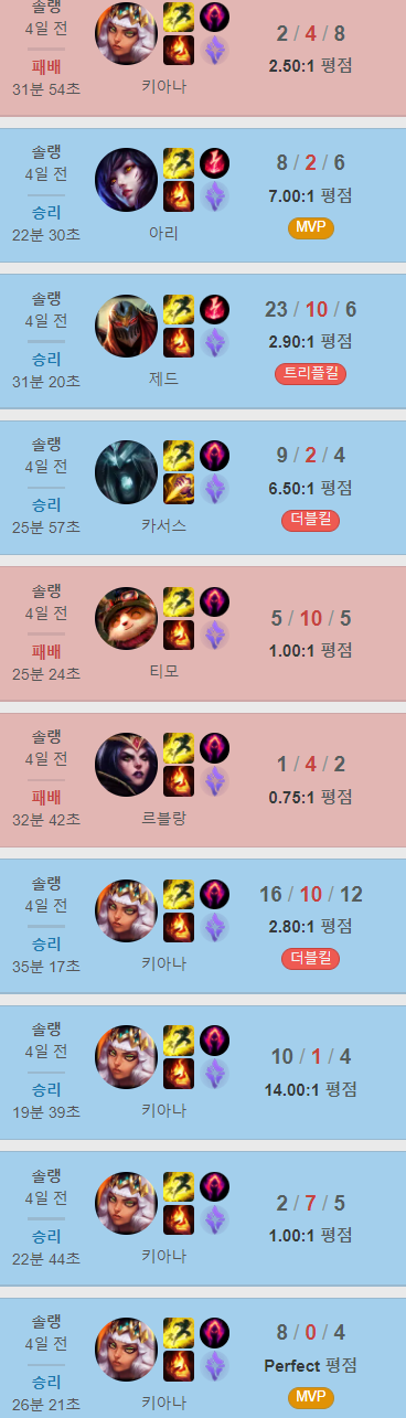 실수는실력 부계정, 시즌11 다이아몬드2티어 78포인트 시즌종료, 무지성 솔로랭크 & 다이아~마스터 승격전 승격청부사 계정인데도 키아나 승률 95% 전시즌 기준 키아나와 몇 챔피언을 제외하고 승률 30%대 전적이 많음에도 불구하고 학살함