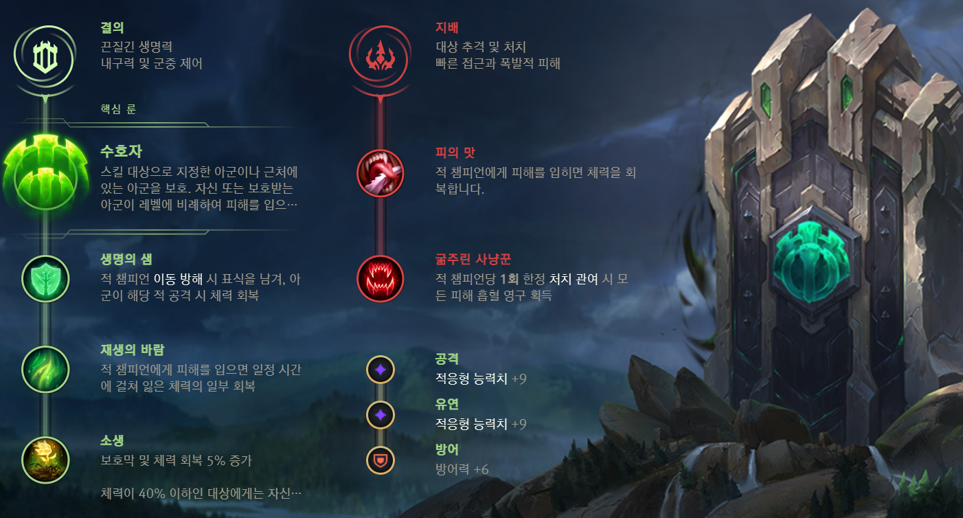레나타가 콩콩이 룬을 꼈을 때는 첫 타 퍼뎀만 미세하게 체감 될 뿐, 수호자는 들어오는 상대팀이 한타에서 레나타 또는 원딜을 포커싱 했을 때 아군과 같이 때리면서 최대 체력 비례 마법피해를 조금 더 줄 수 있다는 장점이 있습니다.