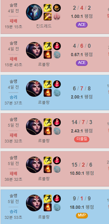 피드백을 받기 전에 메타 챔피언 추천을 받았는데 미드 벡스, 미드 빅토르, 미드 르블랑, 미드 사일러스, 미드 키아나를 팀 조합과 상성에 맞게 돌려보라고 해서 르블랑 키아나 위주로 솔랭을 진행했습니다