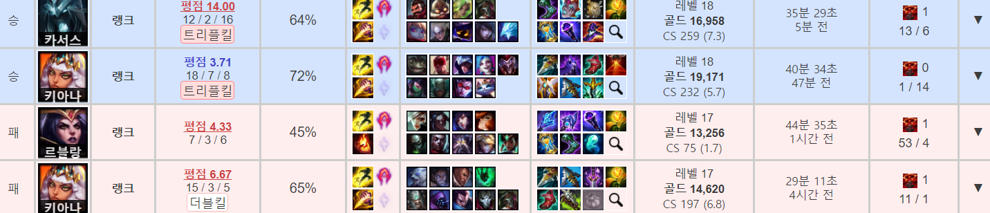 결국 요약하자면 카사딘이나 날먹로밍챔으로 점수 올리거나 원딜형 챔피언, 아니면 팔 엄청 긴 챔피언으로 티어 올리는 방법 외에는 답이 없습니다.