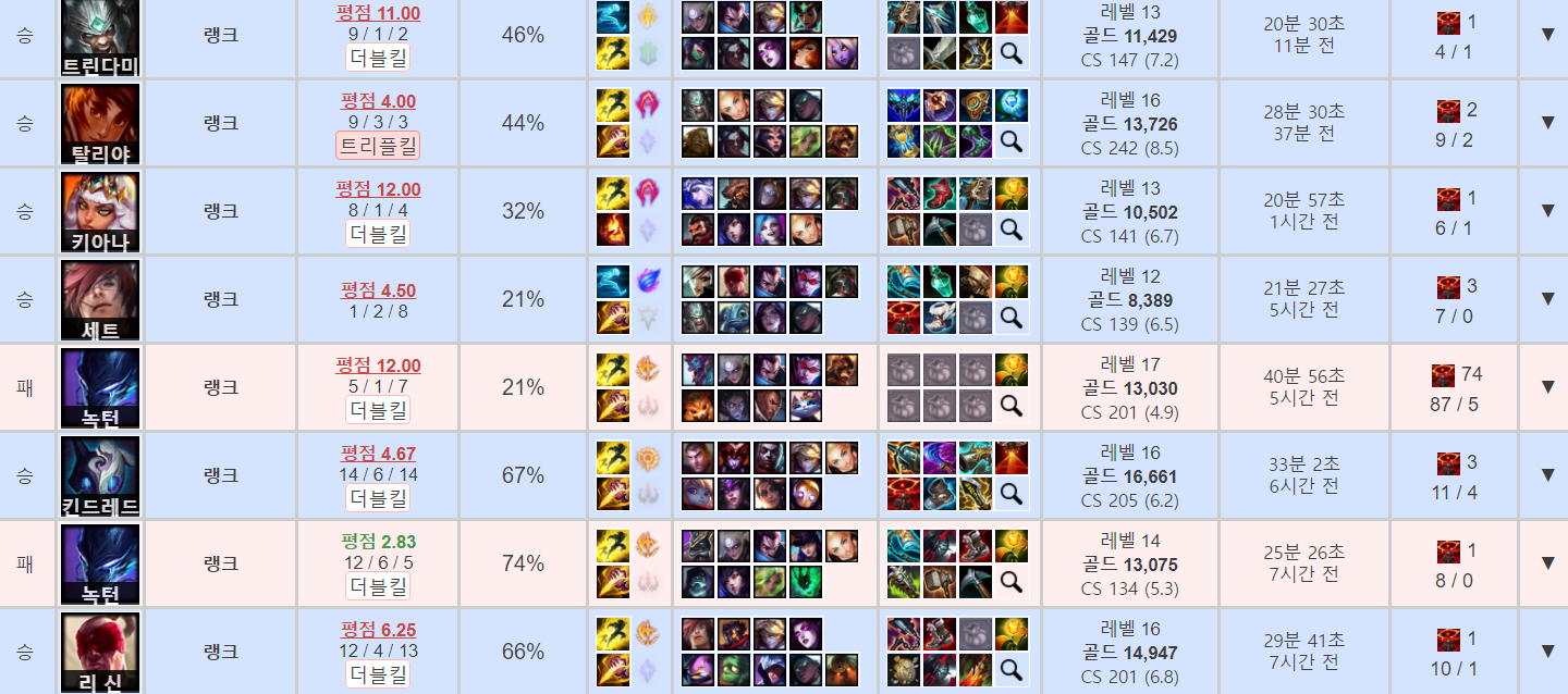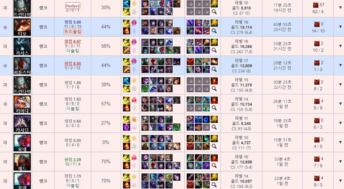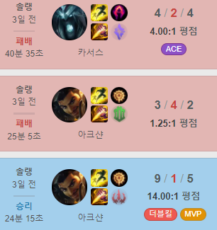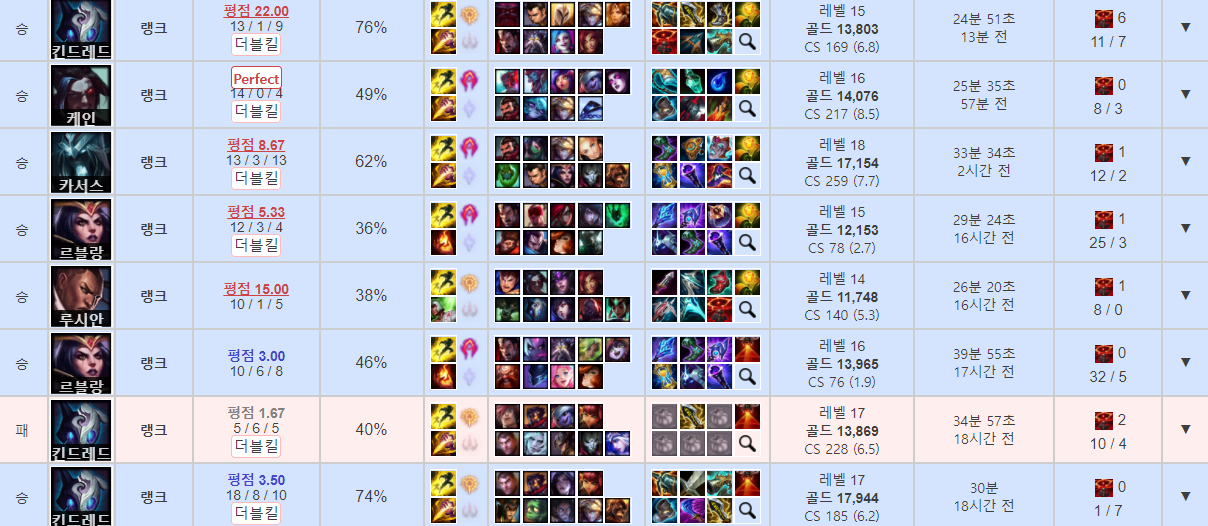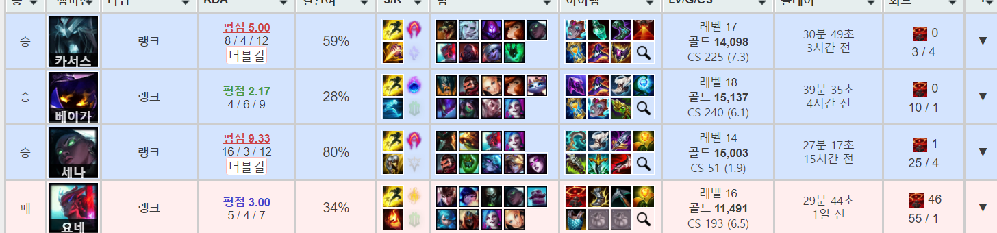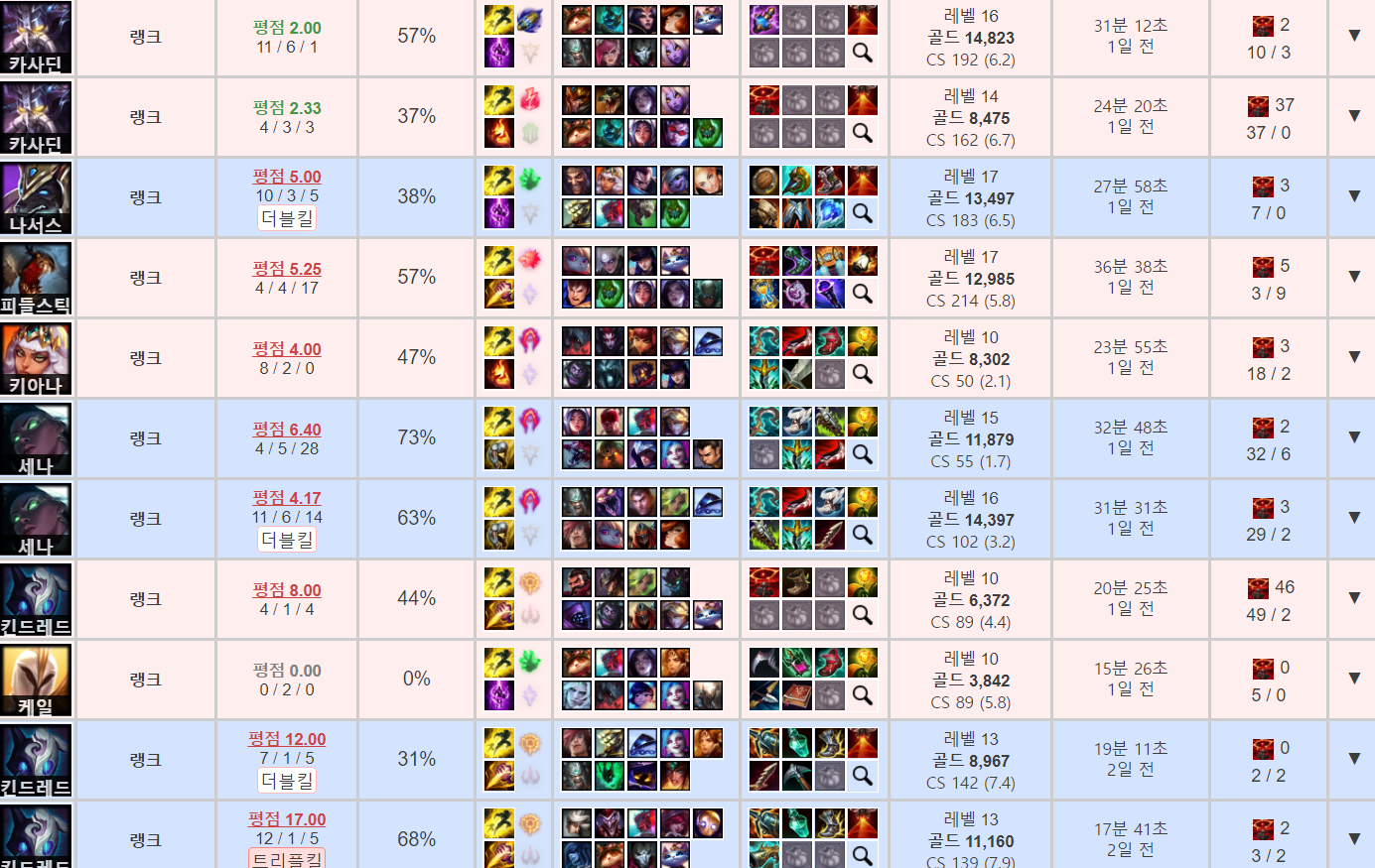 제 성향은 카사딘, 케일, 나서스를 사용해 킬 게임을 하는 것보다 버티면서 성장하는 챔피언으로 탑 미드를 하는 편인데요. 이번 시즌에 드러 서고 벽을 느끼고 있습니다.