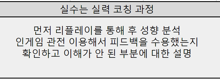 리플레이 부검을 통해 공통적인 문제점을 파악하고 인게임에서 디스코드를 통한 화면 공유를 사용해 피드백 과정을 잘 이해했는지 확인하는 방식으로 진행했습니다.