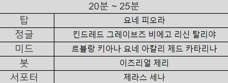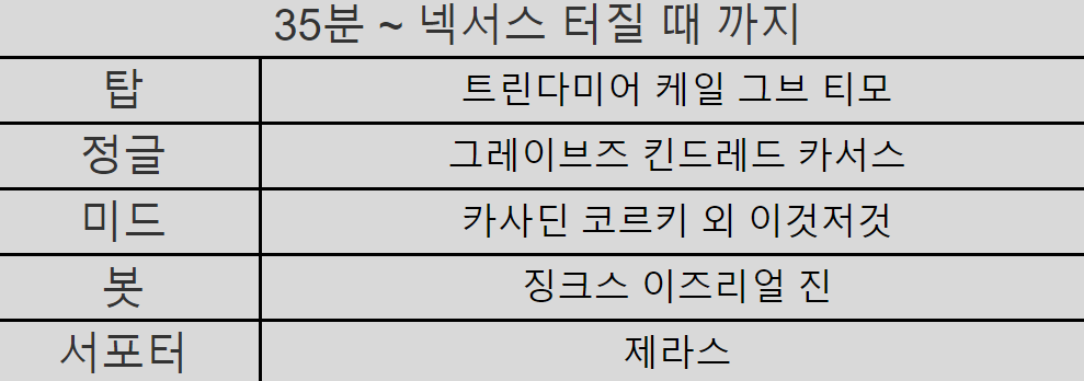 굶주린 사냥꾼이 없다면 풀캠 정글링을 포기하고 두꺼비와 버프만 챙기고 초반 전투 위주의 게임으로 게임을 풀어 나갈 것으로 보입니다.