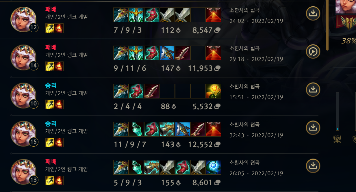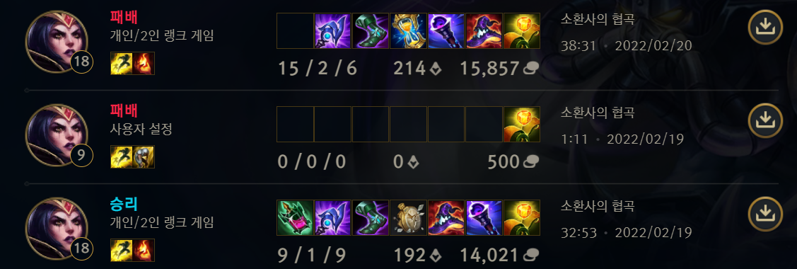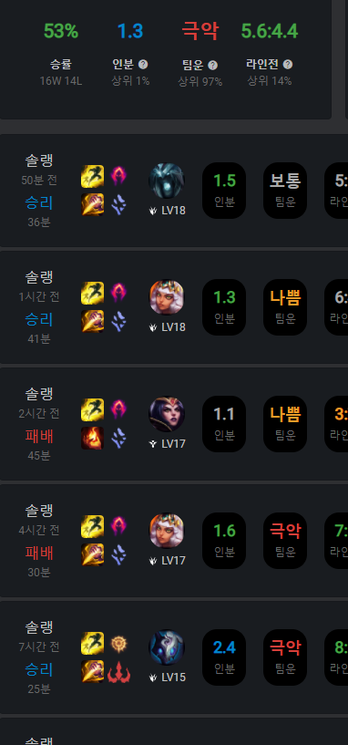 내 라인 말고 다른 라인 합쳐서 15분에 30데스 15분 40데스 나오는 라인 있으면 캐리 불가능하니까 마스터 티어 밑이고 솔랭 점수를 올리고 싶다면 마이크 가능한 사람과 듀오해서 올리자. 이건 선택이지만 전적검색하고 닷지 필수