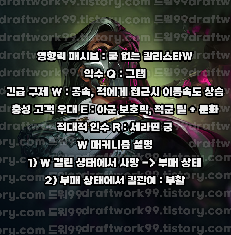 영향력 패시브 : 쿨 없는 칼리스타W 악수 Q : 그랩 긴급 구제 W : 공속, 적에게 접근시 이동속도 상승 충성 고객 우대 E : 아군 보호막, 적군 딜 + 둔화 적대적 인수 R : 세라핀 궁 W 매커니즘 설명 1) W 걸린 상태에서 사망 -> 부패 상태 2) 부패 상태에서 킬관여 : 부활 반박시 draftwork99 블로그 검색해서 댓글