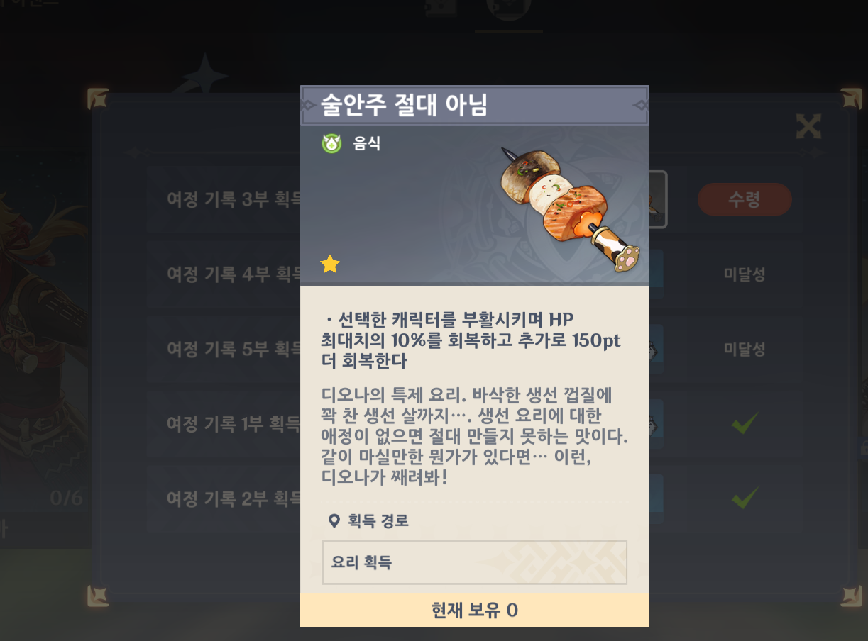 여정 기록 3번을 마치고 디오나의 특제 요리 "술안주 절대 아님"을 획득했습니다.