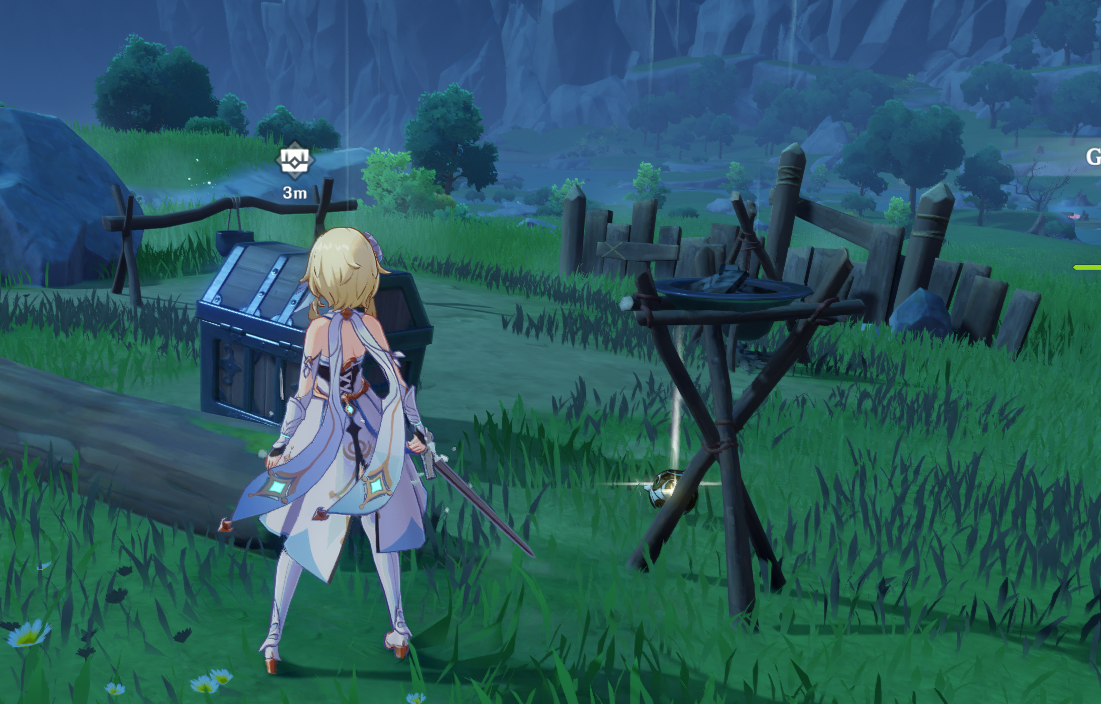 원소 시야를 키고 맵을 확인하면 왼쪽 절벽에 숨겨진 옆에 벽이 있는데, 깨면 보물 상자를 획득할 수 있습니다.