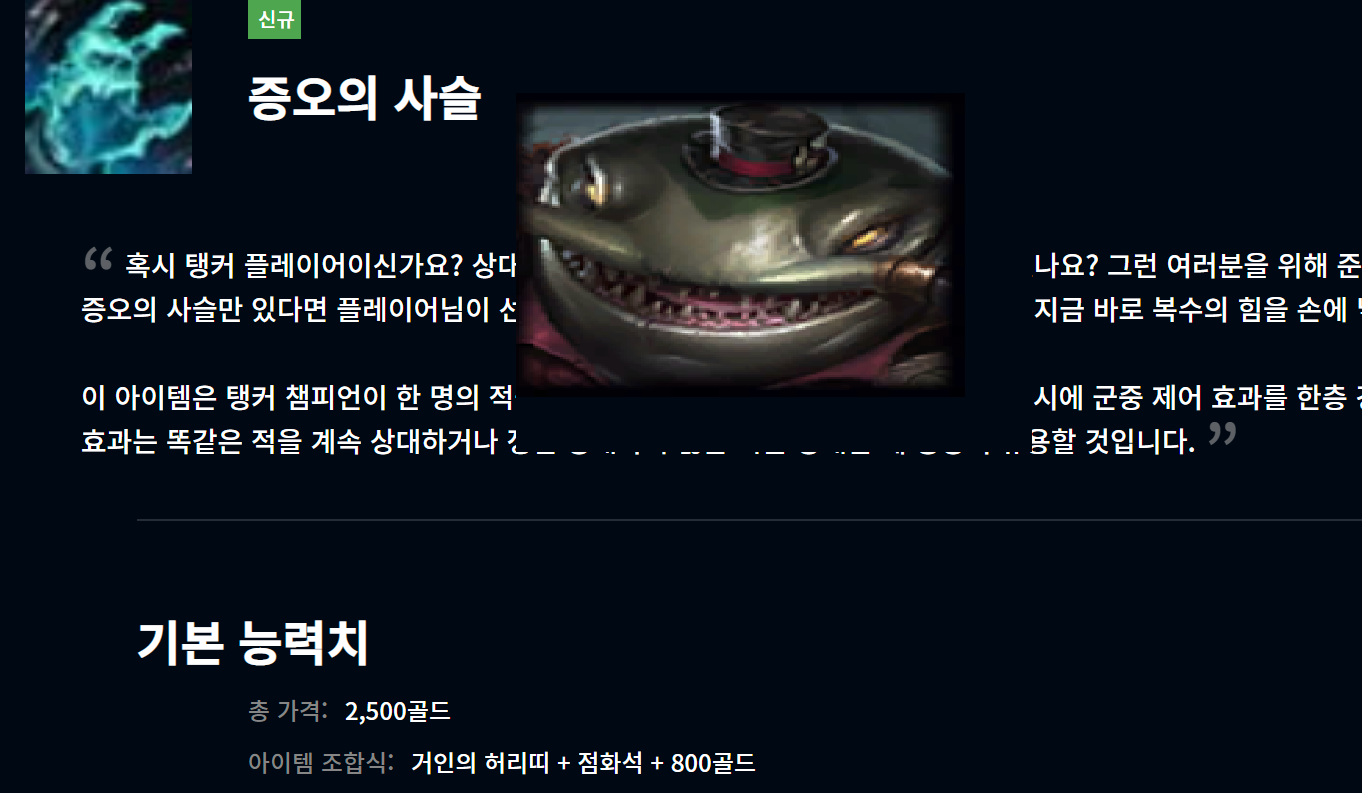 증오의 사슬은 탱커형 챔피언들이 상대팀 CC기가 많고 강력한 AP챔피언에게 사용한다면 큰 무력화를 체감하게 될 것.