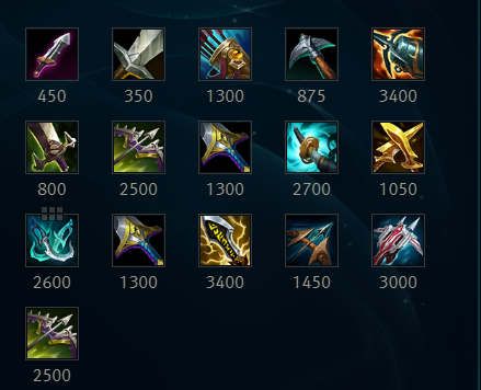 도란의 검 1포션 시작 -> 절정의 화살(표식 유무에 따라 이 타이밍에 다른 원거리 딜러 챔피언만큼 강함) -> 크라켄 or 돌풍 -> 문도박사, 유미, 사일러스, 아펠리오스, 이즈리얼 등 체력 회복 유지력 기반의 챔피언이 있다면 처형인의 대검 이후 BF소드, 핏빛 칼날 -> 유령무희 또는 무한의 대검 -> 도미닉 경의 인사