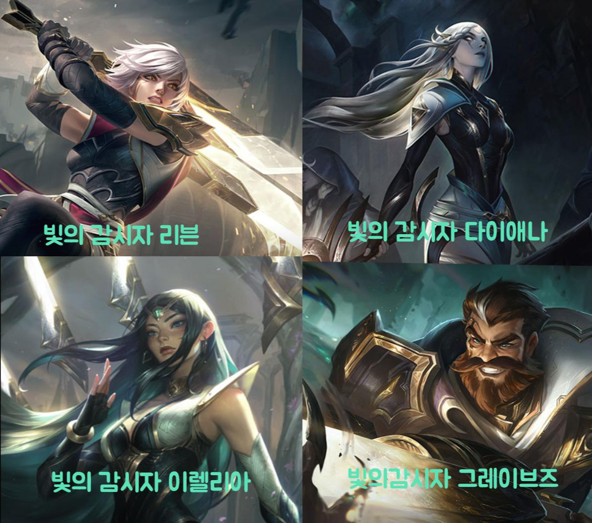 위 4개의 스킨 전부 갖고 싶지만 리븐은 챔피언 숙련도 문제로 저티어에서만 플레이 해야 안정적인 승률이 나오고, 이렐리아는 점화를 통한 킬각을 보는 운영 외에는 방어적으로 라인전 유지하는 방법을 잘 몰라서 안 하게 되고, 빛의 감시자 그브 스킨하고 빛의 감시자 다이애나 스킨은 갖고 싶지만? 몰락한 스킨을 사느라 RP가 없다는 게 아쉽습니다.