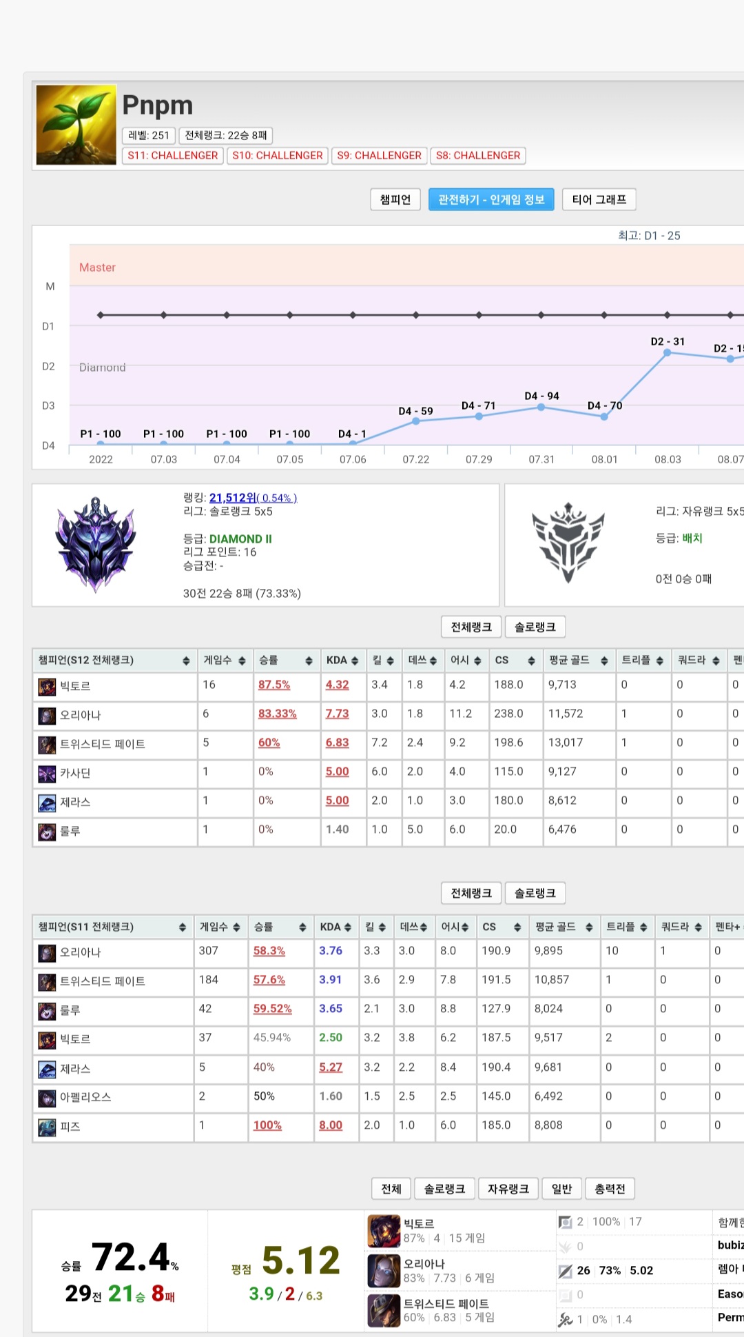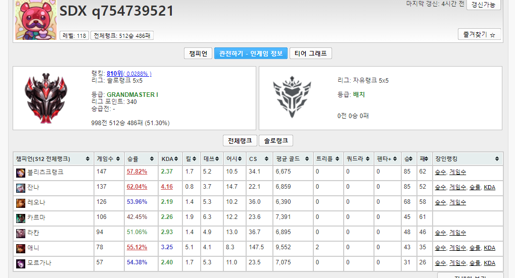 노력 끈기 집중 원딜 모스트, FA MID 쟤랑 스크림 기록 있던데 3군으로 예상됨, SDX와 마찬가지로 썡배 계정인데 의미 없고 이미 쌓인 판수가 많으므로 쌩배충이니 뭐니 하는 건 정말 의미 없고