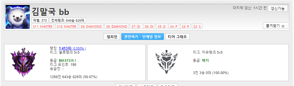 솔랭 열심히 하는 사람 마스터 점수대에도 있나 봤더니 김말국 bb 딱 한 명 있다.
