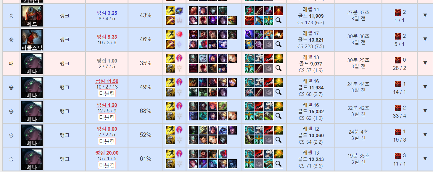 전부 솔로랭크 기준으로 플레이했기 때문에 낮은 것 같음.