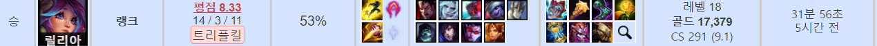 제 성향은 카사딘, 케일, 나서스를 사용해 킬 게임을 하는 것보다 버티면서 성장하는 챔피언으로 탑 미드를 하는 편인데요. 이번 시즌에 드러 서고 벽을 느끼고 있습니다.