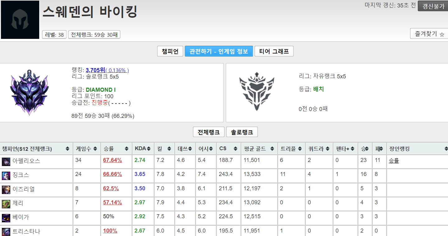 전 챌린저, 전프로게이머 1군 원딜 부계정 스웨덴의 바이킹, 어상내하 슈퍼계정 둘 다 승패차이 30, 티어는 다1, 챌린저 최상위권 챌3위