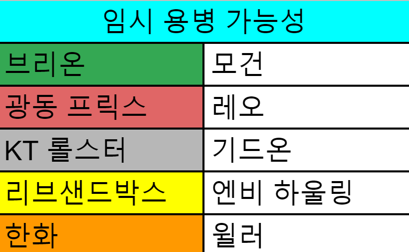 선수 풀을 봤을 때 일시적으로 타 리그 용병, 또는 타 LCK 팀 서브 멤버의 용병 가능성도 있습니다.