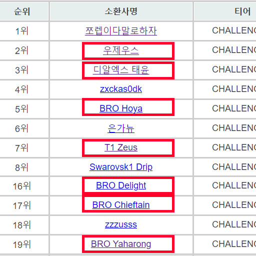 IN 20위 계정이 4명, 제우스가 2계정 부진태윤곤곤래 DRX가 3위