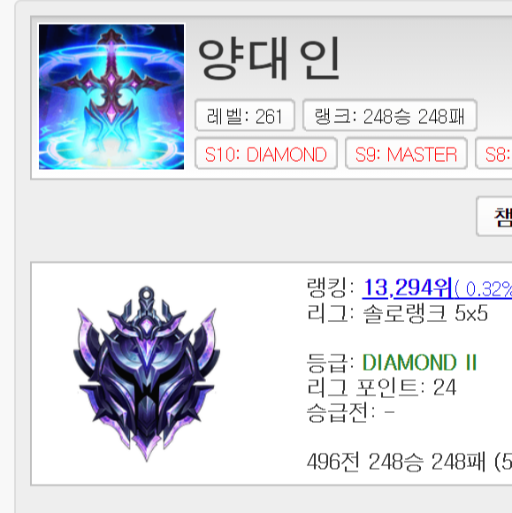 양대인의 현 솔로랭크 티어는 한국 서버 솔로랭크 다이아2, 출퇴근형 감독이 아닌 전략적 분석을 기반으로 둔 16시간 이상 거주형 감독이라고 했을 때